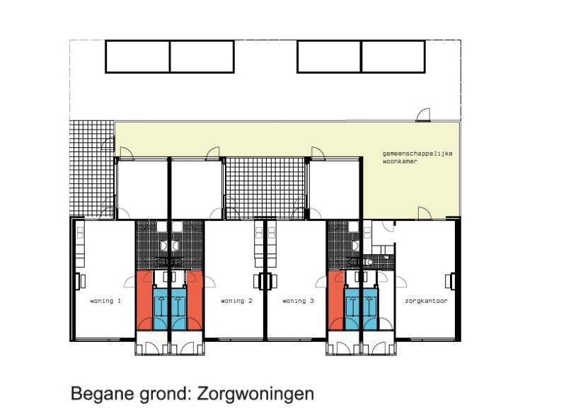 Een transformatie van bestaande woningen tot (zorg)woningen op de begane grond en starters/mantelzorgwoningen op de verdieping. Daarnaast een optie om een woning te transformeren tot zorgkantoorunit, waarin een overdekte achtergalerij ontsluiting met zorgwoningen mogelijk maakt (waarin de bestaande individuele tuinen gemeenschappelijk worden).